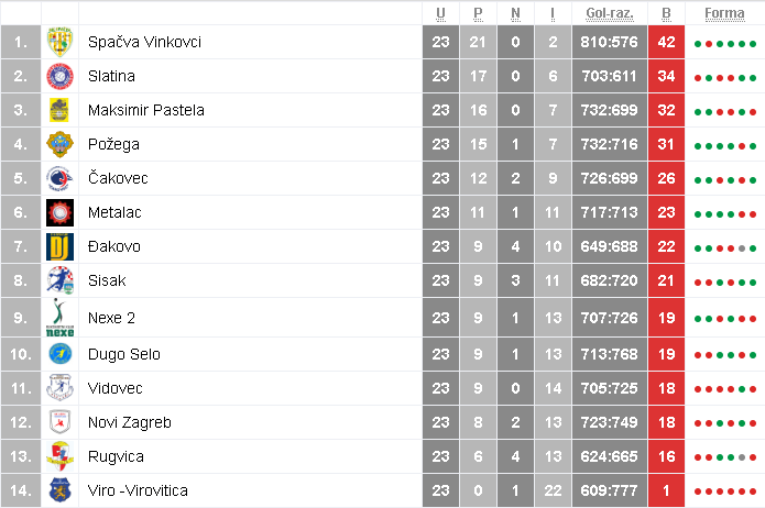 Vrlo tijesan poraz upisala je drugoplasirana Slatina, koja je na gostovanju u Čakovcu izgubila 32:31. Cijeli dvoboj su se momčadi izmjenjivale u vodstvu te su 2 boda mogla otići na obje strane. Na nesreću Slatine, Čakovec se bolje snašao u završnici te uzima puni plijen. Čak 11 pogodaka zabio je Matej Ćuk za Čakovec, dok je Ivan Repić predvodio Slatinu sa 8 pogodaka.