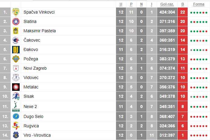 Spačva i dalje pokazuje kako je glavni favorit za naslov prvaka na kraju sezone, a te tendencije potvrđuju novom pobjedom. Ovaj put je u Vinkovcima stradao Novi Zagreb, završilo je 37:31 za domaćine. Podatak o nijednom vodstvu gostiju u ovom susretu dovoljno govori o premoći Spačve. Od prve do posljednje minute vidjelo se koja je momčad bolja na terenu, a krajnji rezultat to maksimalno i govori. Filip Mažurana je predvodio pobjednike sa 6 pogodaka, a 7 pogodaka Davida Kocena nije bilo dovoljno za izbjegavanje poraza gostiju.