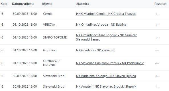 Omladinac iz Vrbove s četiri osvojena boda u prethodnih pet kola u ovom kolu dočekuje Batrinu koja je u prošlom kolu stigla do druge prvenstvene pobjede u srazu s Croatijom iz Tisovca.Omladinac iz Starog Topolja s tri uzastopna poraza dojam će pokušati popraviti u nedjeljnom ogledu kada je domaćin Graničaru iz Slavonskog Šamca koji u susret ulazi nakon prošlotjednog, trećeg ovosezonskog slavlja, nad Omladincem iz Vrbove. S omjerom od tri pobjede i dva poraza u susret šestog kola ulaze Gundinci kojima u goste stiže Zvonimir iz Donje Vrbe koji je prošlotjednim trijumfom nad Omladincem 3:1 stigao također na devet prvenstvenih bodova, koliko u ovom trenutku imaju čak četiri momčadi!