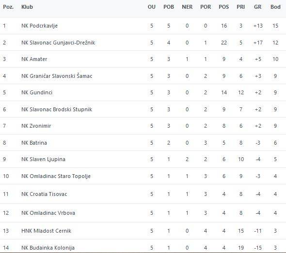 Subotnji dio programa svojim će susretom kompletirati Budainka Kolonija koja kao i Cernička Mladost u kolo ulazi s tri boda i Slaven iz Ljupine koji je u pet odigranih kola skupio jednako toliko bodova. U nedjeljnom dijelu programa lider ljestvice nakon pet kola i jedini sa stopostotnim učinkom, Podcrkavlje, gostovat će u derbiju kola u Gunjavcima/Drežniku kod domaćeg Slavonca koji u susret ulazi s četiri pobjede i jednim porazom, odnosno s tri boda manje od lidera.