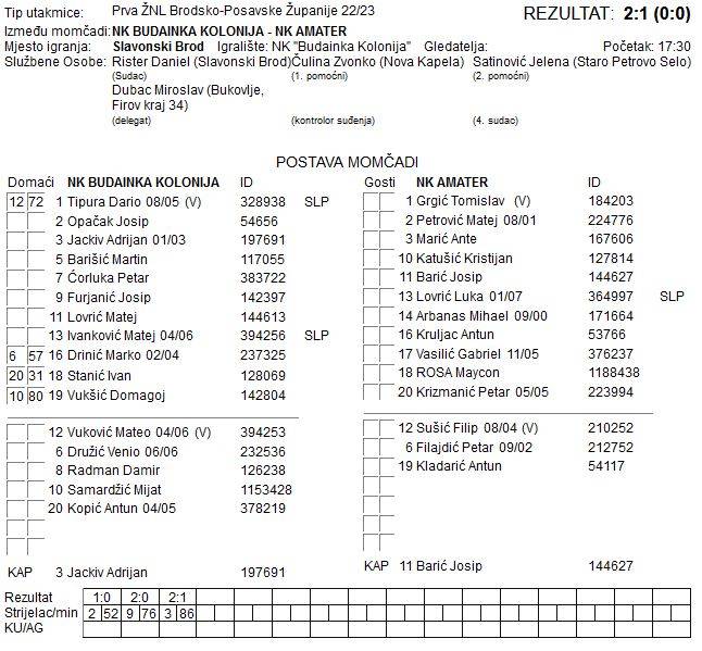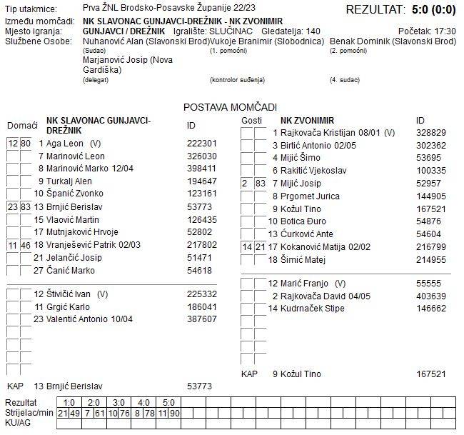 U prvom poluvremenu susreta nije bilo pogodaka, da bi u drugom poluvremenu za domaćine redom zabijeli Josip Jelančić (49′), Leon Marinović (61′),  Zvonko Španić (76′), Marko Marinović (78′) i Karlo Grgić (90′) za konačnih 5:0 za Slavonac,