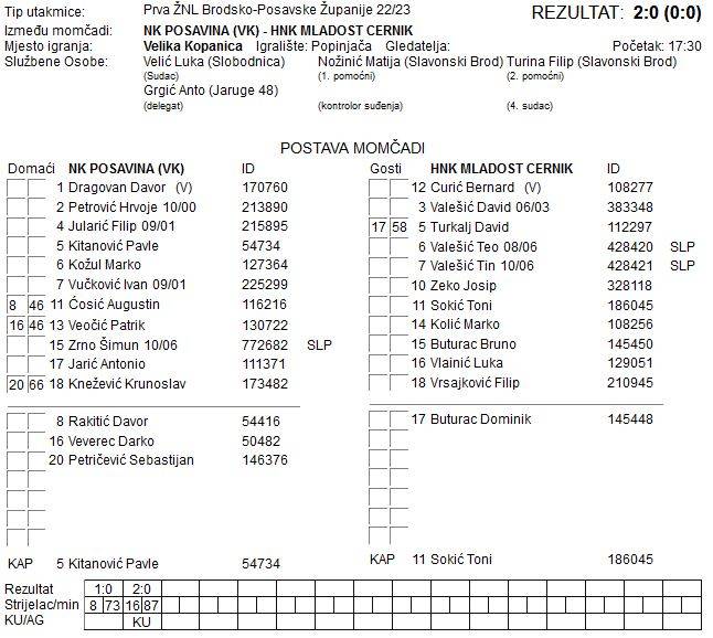 Posavini iz Velike Kopanice s 27 bodova na kontu do spasonosnog jedanaestog mjesta dijelio ih je “samo” bod te im je za prvoligaški ostanak imperativno trebalo slavlje u susretu posljednjeg kola s Mladosti iz Cernika koja je u pravo vrijeme pronašla formu te se s tri uzastopna slavlja izdigla iz opasne zone te rasterećenije ušla u posljednje kolo.