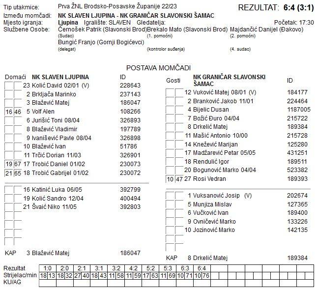 U najefikasnijem susretu kola do 6:4 slavlja stigao je Slaven iz Ljupine te se vratio na četvrto mjesto poretka. Hat-trick u slavlju Slavena postigao je Gabrijel Trobić (13′, 32′ i 43′), dok su po jedan pogodak nadodali Dorian Trčić (59′), Daniel Trobić (63′) i Ivan Blažević (71′). S druge strane, kod gostiju dva je zgoditka postigao Antonio Mašić (58′ i 69′), a po jednom su mrežu domaćina tresli Vedran Rosi (40′) i Marko Jozinović (76′).
