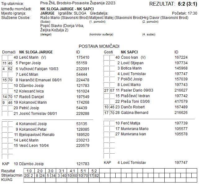 Za kraj sezone Sloga je uprihodila 5:2 slavlje koje joj nije pomoglo da se pomakne sa za njih nesretnog 13. mjesta te će nagodinu i oni igrati u 2. ŽNL. Pogotke za Slogu postigli su Josip Petrić (2′), Emanuel Narančić (24′), Josip Perger (34′) te Josip Džambo u dva navrata (60′ i 70′), dok su za Sapce bili precizni Marin Botica (40′) i Mario Munivrana (82′).