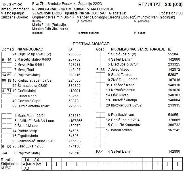 U prvom poluvremenu derbija mreže se nisu tresle da bi u 60. minuti Vinogorac poveo autogolom Seiferta, a prva meč lopta za Vinogorac stigla je u 80. minuti iz kaznenog udarca kojeg brani vratar gostiju Josip Sudić. No, potvrda pobjede domaćina ipak je stigla u prvoj minuti sučeve nadoknade kad konačnih 2:0 za Vinogorac postavlja Mateo Škorić za potvrdu titule. Treneru Vinogorca Mariju Ćubelu iskrene čestitke na naslovu, dok će se Omladinac iz Starog Topolja morati zadovoljiti drugim mjestom i osvojenim kupom BPŽ.