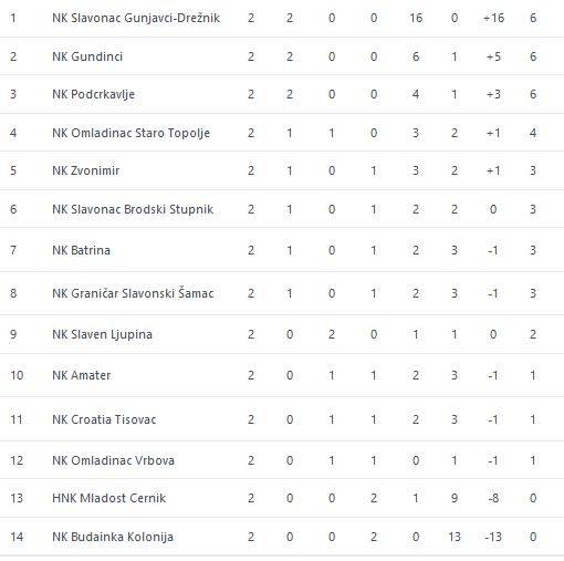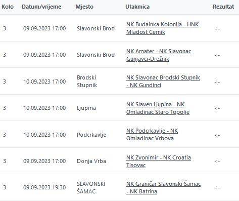 Subotnji program svojim će večernjim susretom zatvoriti Graničar iz Slavonskog Šamca koji je nakon poraza u Donjoj Vrbi slavio u Cerniku 1:2 i ekipa Batrine koja je nakon poraza u Starom Topolju u drugom kolu nadvisila Zvonimir iz Donje Vrbe 2:1. Momčad Podcrkavlja također je u prvenstvo ušla s dvije uvodne pobjede (2:0 domaća pobjeda nad Batrinom i gostujuće slavlje u Tisovcu 1:2), a u trećem kolu snage će odmjeriti u nedjeljnom susretu s Omladincem iz Vrbove, koji je u drugom kolu stigao do prvog boda u domaćem susretu sa Slavenom iz Ljupine.