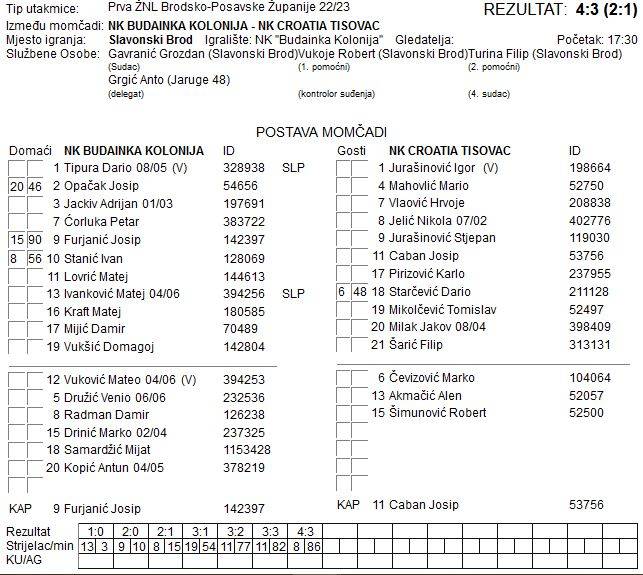 Do iznimno vrijedne pobjede u borbi za ostanak stigla je Budainka! Domaćini su furiozno ušli u susret te poveli pogocima Mateja Ivankovića u trećoj i Josipa Furjanića u 10. minuti, Gosti su se uspjeli vratiti pogotkom Nikole Jelića u 15. minuti te se s 2:1 prednošću domaćina otišlo na odmor. U devetoj minuti drugog poluvremena Domagoj Vukšić povisio je prednost domaćina na dva pogotka, no Croatia se zgodicima Josipa Cabana u 77. i 82. vraća potpuno u susret i izjednačuje na 3:3. Pogodak vrijedan tri boda za Budainku ali i iznimno važna tri boda u borbi za ostanak djelo je Damira Radmana u 86. minuti.