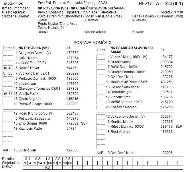 Graničar je odlično ušao u gostujući ogled u kojem ih je u početno vodstvo doveo Marko Ovničević u četvrtoj minuti. Mreže su mirovale sve do 54. minute kada Ovničević svojim drugim pogotkom udvostručuje prednost gostiju. Posavina je uspjela izjednačiti dvama pogocima Patrika Veočića u 68. i 75. minuti susreta, a pobjedu gostima iz Slavonskog Šamca i konačni rezultat 2:3 donio je Antonio Mašić u 88. minuti susreta.