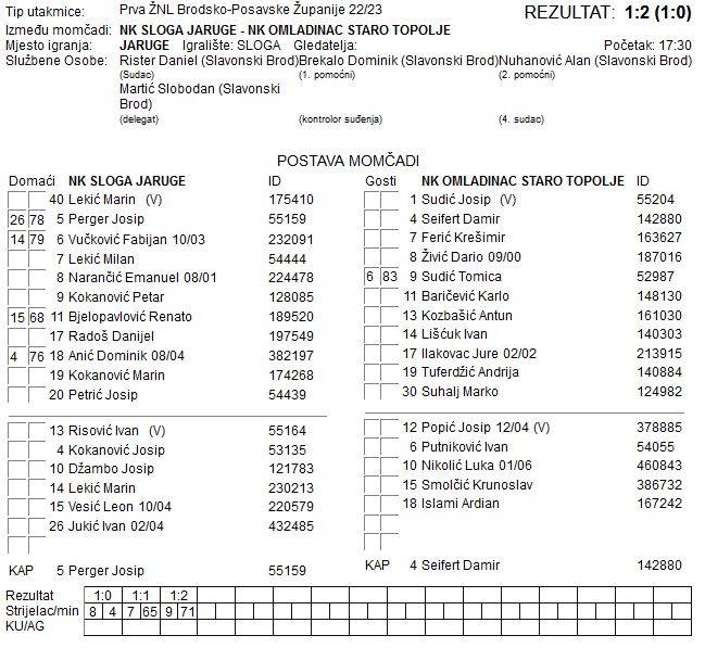 -“Danas smo bili odlični do 30. minute, vrlo dobri do 60. minute i dobri posljednjih 30 minuta što nam nije bilo dostatno za bodove. Dečki su dali svoj maksimum i ludim ulaskom u utakmicu na svježinu i srčanost poveli i milimetri su nas dijelili od drugog gola. Kako je utakmica odmicala gosti su sve više kontrolirali loptu i u zadnjoj trećini utakmice preokrenuli rezultat prekrasnim eurogolom i na kraju nakon prekida za 1:2. Danas smo zbog obiteljskih obveza (pričest, krizma, vjenčanje) igrali bez sve trojice kapetana (Joskić, Džambo i Kolesarić) jer gosti nikako nisu izašli u susret da se igra sutra kao što to rade klubovi viših rangova kao jučer Kutjevo i Slavija. Bila bi to još “vatrenija” tekma. Još jednom čestitke svim sudionicima utakmice jer je ulog relativno velik a igrala se korektna utakmica. Omladincu želim da podignu pehar na kraju prvenstva a u pretkolu HR kupa da dobiju neki klub na moru da se barem dobro provedu.”- komentirao je trener Ivica Beraković, Sloga Jaruge.