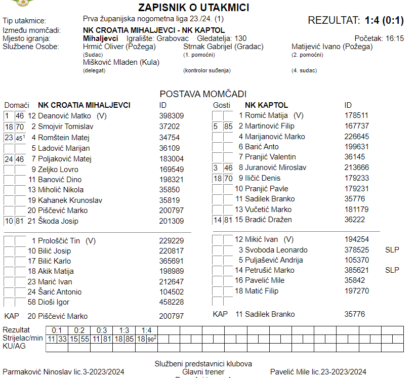 U susret ovom dvoboju obje ekipe bile su bodovno izjednačene, ali ovom pobjedom Kaptol se odvojio od Croatie. Gosti su poveli preko Sadileka da bi nakon toga u domaćim redovima crveni karton poremetio planove. U nastavku utakmice Kaptol nije dopuštao da pitanje pobjednika dođe u obzir pa je u drugom dijelu još tri puta tresao mrežu. Počasni pogodak domaćini su zabili u sudačkoj nadoknadi. Trener Croatie Mihaljevci, Ninoslav Parmaković više neće obnašati spomenutu fuknciju, a mi mu ovim putem želimo puno sreće u nadolazećim izazovima.
