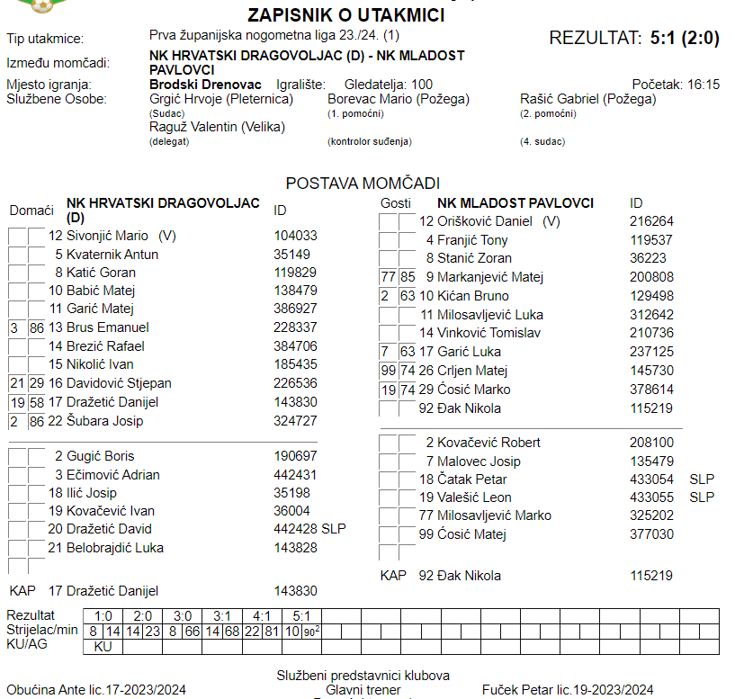 Domaćin iz Drenovca uvjerljivom je pobjedom došao do nova 3 boda. Premda rezultat sugerira na laganu pobjedu, Dragovoljci su se zaista morali potruditi i biti nemilosrdni u završnici. Brezić i Katić su se u strijelce upisali po dva puta, a točku na i stavio je Babić. Gosti su uspjeli doći do jednog pogotka što je bilo djelo Vinkovića.