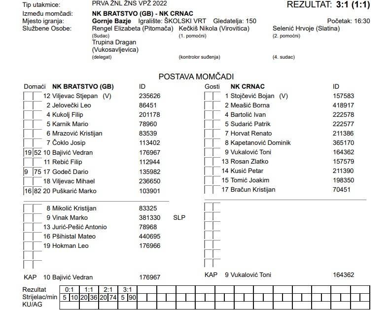 U subotu je odigrana jedna utakmica 17. kola 1. ŽNL Virovitičko-podravske županije. Bratstvo iz Gornjeg Bazjea na svom je terenu dočekalo Bratstvo. Domaćini su na kraju susreta zadovoljno trljali ruke jer su uspjeli osvojiti i zadržati tri boda kod sebe.