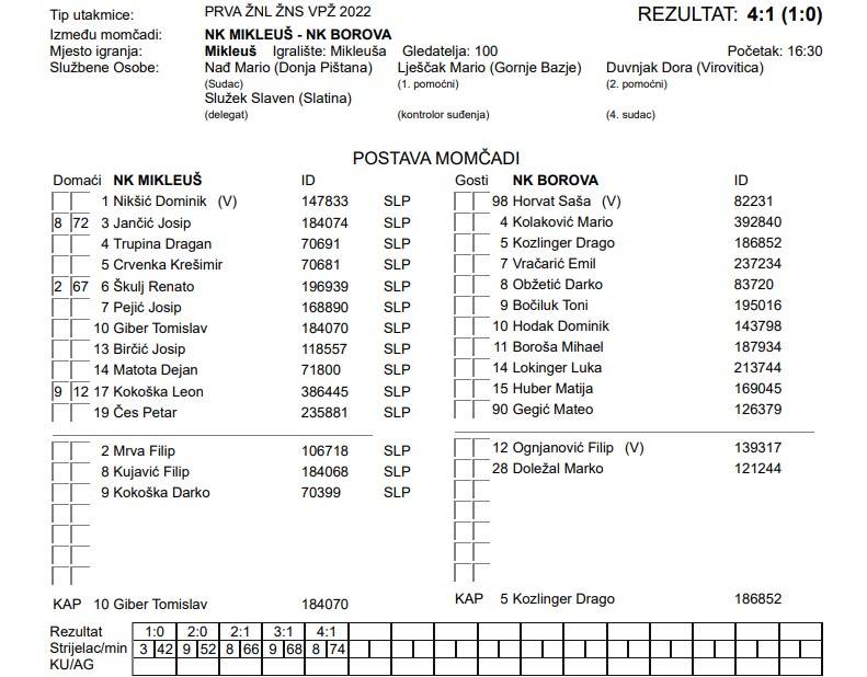 Iako podjednaka utakmica po borbi, na kraju je uspješnost realizacije otišla domaćinu. Mikleuš je u završnom dijelu terena jednostavno bio konkretnija momčad i zasluženo slavio. Dario Kokoška dao je dva gola (52′, 68′), dok su po jedan pogodak djela Josipa Jančića (42′) i Filipa Kujavića (74′). Jedini gol za Borovu uspio je zabiti Darko Ožbetić u 66. minuti susreta.