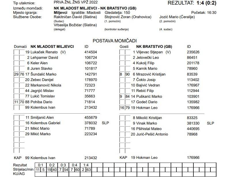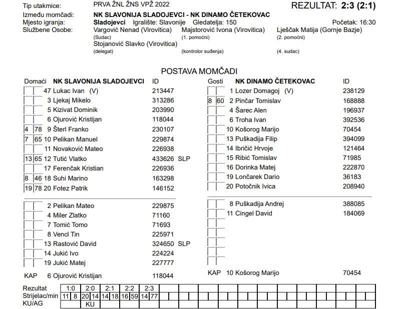 “Odlično otvaramo utakmicu te već u prvih dvadesetak minuta vodimo 2-0. Prvi gol u režiji Novakovića koji zabija nakon spuštanja glavom Foteza, dok za 2-0 nakon nepropisnog zaustavljanja Ferenčaka siguran s bijele točke je Fotez. Nakon toga kreće nonšalantna igra naše ekipe te gost to koristi i zabija za 2-1 do kraja poluvremena. Drugo poluvrijeme nastavljamo u tom ritmu te treću utakmicu za redom dobivamo crveni karton. Ovaj puta, do tog trenutka najbolji na terenu, Ferenčak kasni u jednom duelu i dobiva drugi žuti karton. Nakon toga naše glave padaju te do kraja primamo jos dva gola s igračem manje i gubimo već dobivenu utakmicu“, poručili su iz Slavonije.