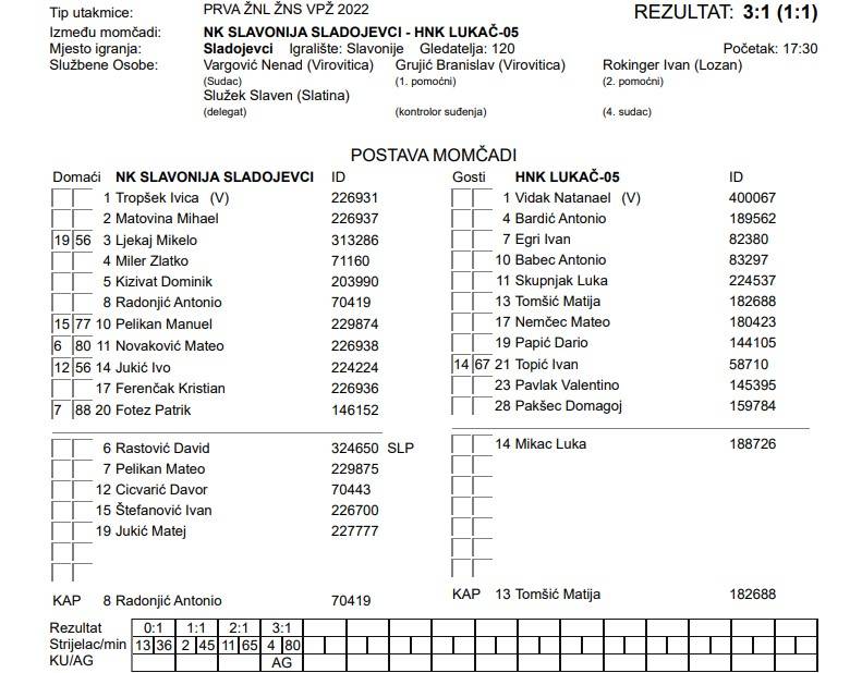 Slavonija je na svom terenu slavila protiv trećeplasirane momčadi prvenstva. Matija Tomšić doveo je Lukač u vodstvo u 36. minuti susreta. U 45. Mihael Matovina izjednačio je prije odlaska na odmor. U nastavku su domaćini u potpunosti preokrenuli rezultat. Za 2:1 zabio je Mateo Novaković u 65., dok je konačni rezultat autogolom postavio Zlatko Miler u 80. minuti susreta.
