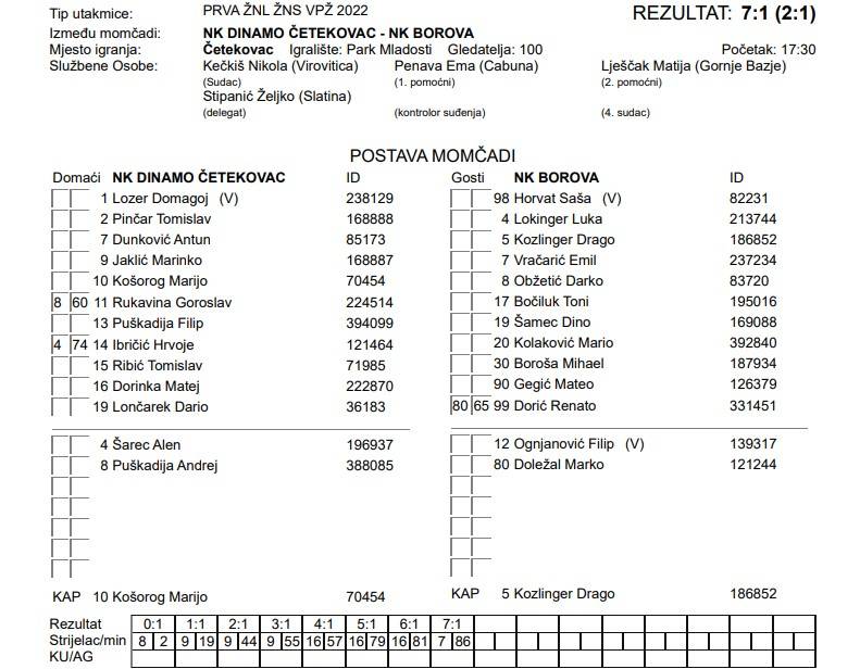 Velika pobjeda Dinama koji je razbio Borovu na svom terenu. Po tri pogotka postigli su Marinko Jaklić (19′, 44′, 55′) i Matej Dorinka (57′, 79′, 81′), dok je jedan djelo Antuna Dunkovića u 86. minuti susreta. Jedini gol za Borovu postigao je Darko Ožbetić u drugoj minuti susreta.