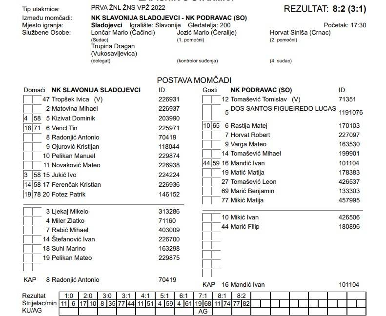 Još jedan prikaz dominacije pokazala je Slavonija nad posljednjeplasiranom ekipom prvenstva. Jedina dva pogotka za goste postigao je Matija Mikić u 44. i 82. minutama susreta. Junak susreta bio je Mateo Novaković koji je postigao hattrick (6′, 51′, 74′). Zlatko Miler dvaput se upisao u strijelce (59′, 61′). Jednom su to bili Kristian Ferenčak (10′), Antonio Radonjić (35′) i Matija Matić autogolom u 68. minuti susreta.