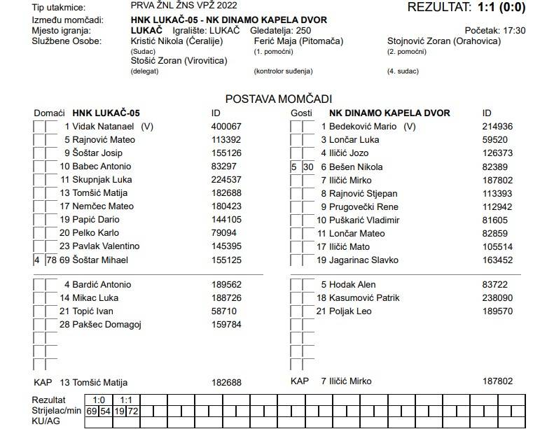 Jedini subotnji dvoboj odigrao se danas u Lukaču. Tamo su se susreli Lukač 05 i Dinamo iz Kapele Dvor. Poprilično izjednačena utakmica na kraju je završila onako kako je i počela – bez prednosti bilo koje momčadi.