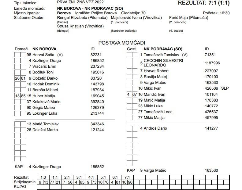 Sasvim zaslužena pobjeda Borove protiv Podravca iako je u prvom poluvremenu susret djelovao izjednačeno. Po dva pogotka postigli su Darko Ožbetić (13′, 73′), Drago Kozlinger (65′, 81′) i Dominik Hodak (76′, 90′), dok je jedan djelo Emila Vračarića (56′). Jedini gol za goste dao je Matija Mikić u 21. minuti susreta.