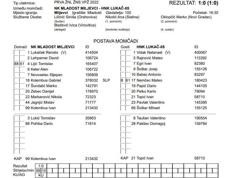 Još jedan iznenađujuć poraz dogodio se na virovitičko-podravskim terenima. Akteri novog iznenađenja bili su Mladost Miljevci i Lukač. Domaćini su slavili i upisali tri vrijedna boda. Jedini gol na utakmici zabio je Ivan Kolembus u 10. minuti iz kaznenog udarca.