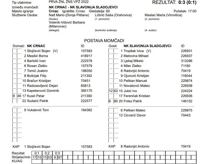 Rutinska pobjeda Slavonije na gostovanju kod Crnca. Jedan gol u prvom i dva u drugom bila su dovoljni pokazatelj raspodjele snaga. Zabio je Kristian Ferenčak u 15. minuti susreta. Na 0:2 povisio je Mateo Novaković u 53. minuti. Konačni rezultat postavlja Kristijan Ojurović u 87. minuti susreta.