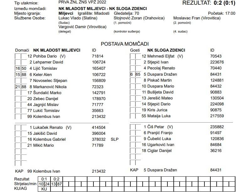 Rutinska pobjeda dogodila se i u Miljevcima. Sloga je s nova tri boda tri kola prije kraja i nedostižnih 10 bodova potvrdila naslov prvaka. Za veliko slavlje gosta pobrinuli su se Mario Duspara i Mateo Jerešić. Duspara je u 24. minuti iz kaznenog udarca doveo Zdenčane u vodstvo, a Jerešić je sve mirno priveo kraju u 87. minuti utakmice.