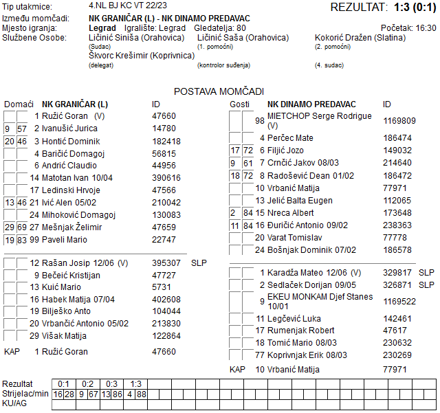 Gosti iz Predavca došli su u vodstvo u 28. minuti susreta pogotkom Antonija Đuričića, a tu prednost su udvostručili u 67. minuti preko Ekeua. Pobjedu Dinama potvrdio je Eugen Jelić Balta u 86. minuti susreta, da bi počasni pogodak za domaćina postigao Domagoj Baričić u 88. minuti.