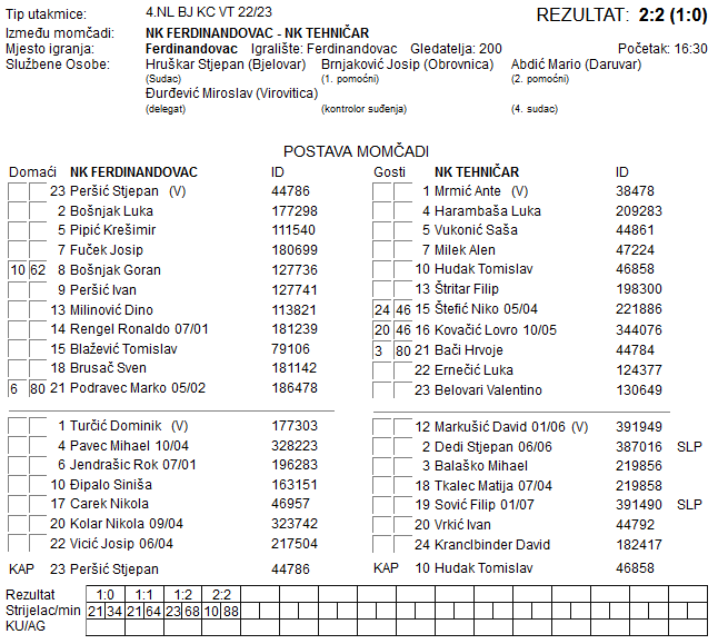 Derbi je u Ferdinandovac doveo više od 200 gledatelja koji su imali priliku uživati u odličnoj predstavi oba takmaca. Domaćin je poveo u 34. minuti pogotkom Marka Podraveca, da bi gosti sredinom drugog poluvremena preokrenuli susret pogocima Hrvoja Bačija u 64. i Valentina Belovarija četiri minute kasnije. Ipak, Ferdinandovac uspjeva preko Siniše Đipala u 88. minuti izjednačiti susret za konačnih 2:2 i podjelu bodova u Ferdinandovcu!