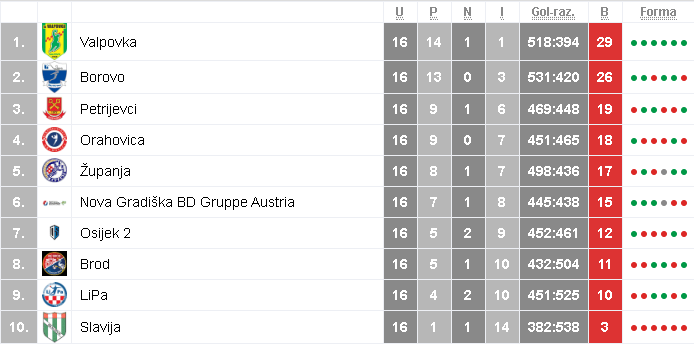 Orahovica je iskoristila domaći teren te slavila 30:26 nad Petrijevcima, ponajviše zbog 9 pogodaka Domagoja Kiša. Lijepih 8 pogodaka postigao je Ivan Barišić u pobjedi svojeg Osijeka 38:28 nad LiPom. Valpovka na gostovanju u Slavonskom Brodu nije dopustila iznenađenje te je slavila 23:34. Županji nije pomoglo čak 10 pogodaka Luke Omrčanina u porazu 30:36 od raspoloženog Borova. Nova Gradiška je na gostovanju kod Slavije slavila s uvjerljivih 24:39, uz 7 pogodaka Sebastiana Kolića.