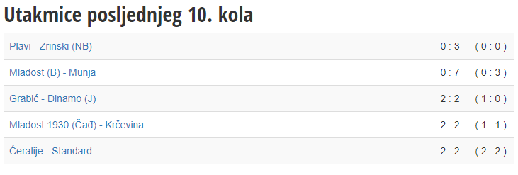U dvoboju momčadi iz donjeg dijela ljestvice sastali su se devetoplasirana Mladost iz Čađavice s tri boda na kontu te Krčevina koja u devet prethodnih kola još nije osjetila slast prvenstvenih bodova. I ovaj susret zanimljivo, završio je rezultatom 2:2. Pogotke za Mladost postigli su Livio Brozović (38′) i Tomislav Kovač (82′), dok je oba pogotka za Krčevinu postigao Antun Đurasek (12′,78′).