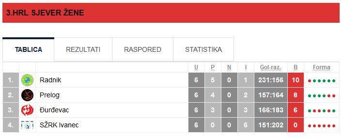 U nedjeljnom dijelu programa Prelogu s omjerom od tri pobjede i dva poraza stigao je lider ljestvice Radnik iz Križevaca s maksimalnih deset bodova iz pet dosadašnjih susreta. U prvom poluvremenu gotovo se cijelo vrijeme igralo gol za gol, no na predah je s minimalnom prednošću ipak otišao Prelog (14:13). Sredinom drugom poluvremena Prelog je uspio doći do plus pet, Radnik je uspio nešto smanjiti no za potpuni povratak ipak nije dovoljno vremena. U pobjedi Preloga 32:29 osam je pogodaka postigla Pavla Iglec, dok je jedanaest zgoditaka kod Radnika skupila Hana Horvat.