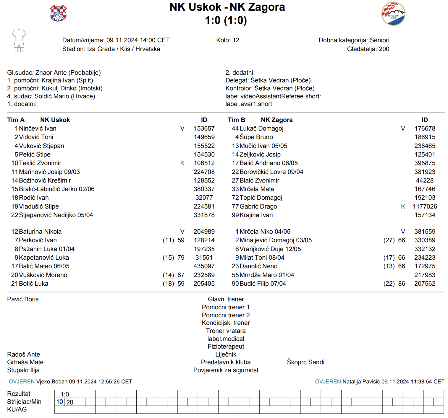 Uskok je minimalnom pobjedom savladao Zagoru rezultatom 1:0. Ključan trenutak dogodio se u 20. minuti kada je Zvonimir Teklić postigao jedini pogodak na utakmici, donijevši tri boda svojoj ekipi. Ovom pobjedom Uskok se učvrstio pri vrhu ljestvice, dok Zagora ostaje u gornjem dijelu tablice.