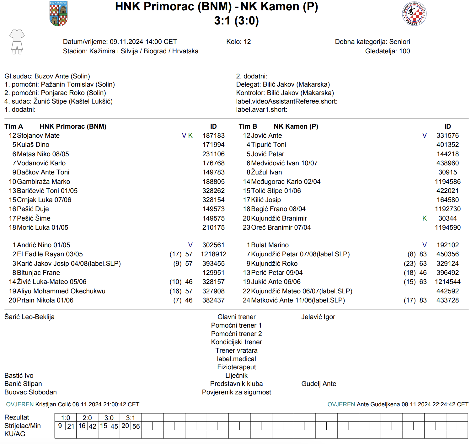 Primorac je ostvario važnu pobjedu na domaćem terenu svladavši Kamen rezultatom 3:1. Ante Toni Bačkov otvorio je rezultat u 21. minuti, a Duje Pešić je povećao prednost domaćih u 42. minuti. Luka Crnjak je u 45. minuti postavio rezultat na 3:0 u korist Primorca, zaključivši prvo poluvrijeme uvjerljivom prednošću. Kamen je smanjio zaostatak u 56. minuti preko Branimira Kujundžića, ali nije uspio preokrenuti rezultat. Ovom pobjedom, Primorac je osvojio vrijedne bodove i popravio svoju poziciju na tablici.