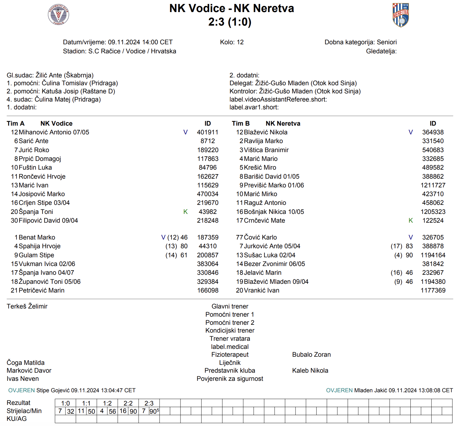 U uzbudljivoj utakmici, Neretva je pobijedila Vodice s 2:3. Roko Jurić doveo je Vodice u vodstvo u 32. minuti, ali je Neretva preokrenula rezultat golovima Antonija Raguža u 50. i Maria Marića u 56. minuti. Stipe Crljen je u 90. minuti izjednačio za Vodicea Ante Jurković je u petoj minuti sudačke nadoknade postigao pobjednički gol za Neretvu. Neretva ovom pobjedom ostaje lider prvenstva.