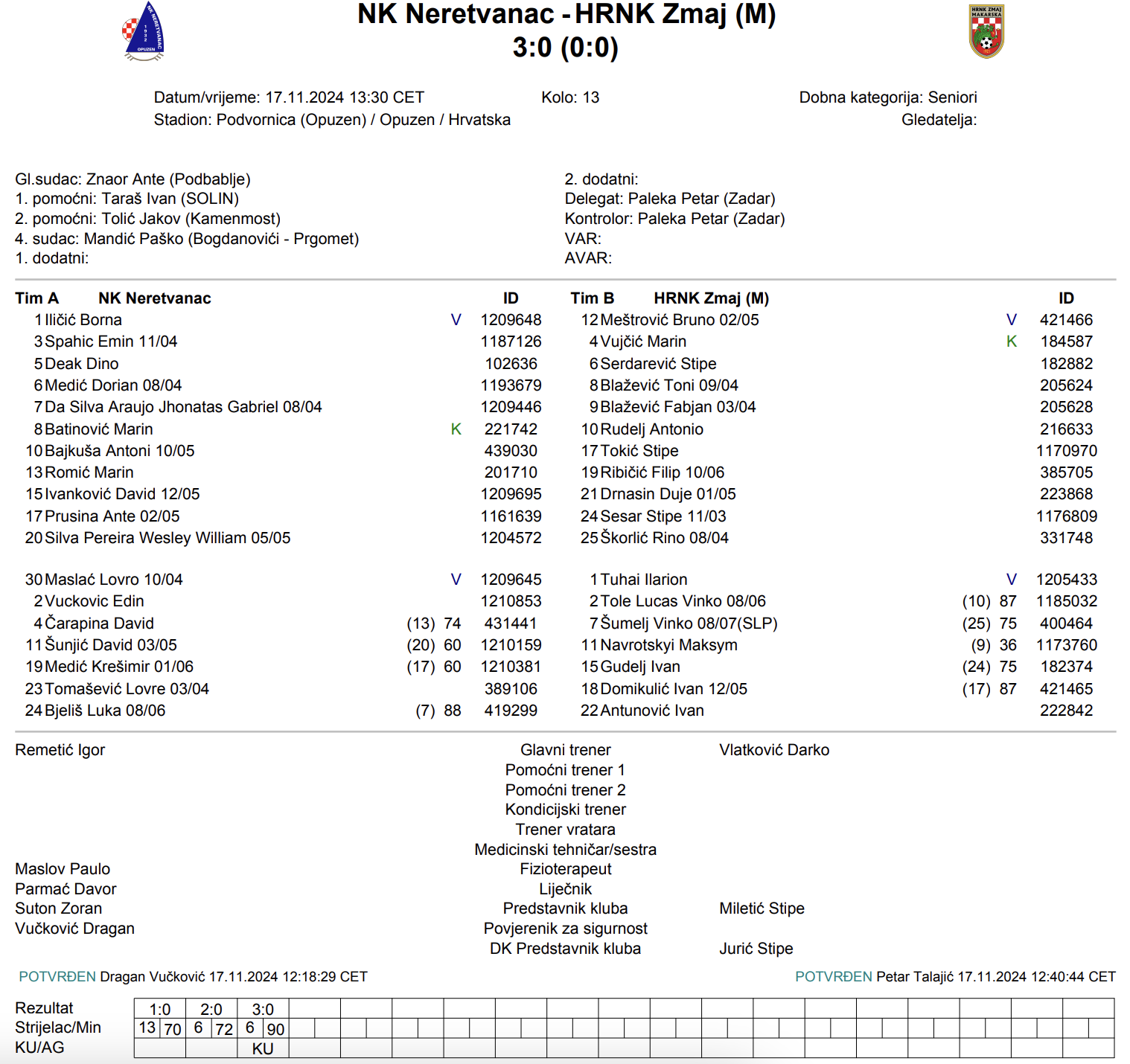 Vrlo izjednačena utakmica odigrana je na Podvornici u Opuzenu. Prvo poluvrijeme odgovaralo je prikazanoj igri i završilo rezultatom 0:0. U drugom poluvremenu nastavila se ravnopravna borba, no sve se promijenilo u 70. minuti kada Neretvanac otvara mrežu Makarske pogotkom Marina Romića. Samo dvije minute kasnije, Neretvanac povećava vodstvo na 2:0 pogotkom Dorijana Medića. Medić je u 90. minuti iz kaznenog udarca postigao svoj drugi pogodak, odnosno treći za Neretvanac, čime je postavio konačan rezultat. Neretvanac se sada popeo na 11. mjesto s 15 bodova, dok je Zmaj ostao pri dnu tablice sa samo 6 bodova.