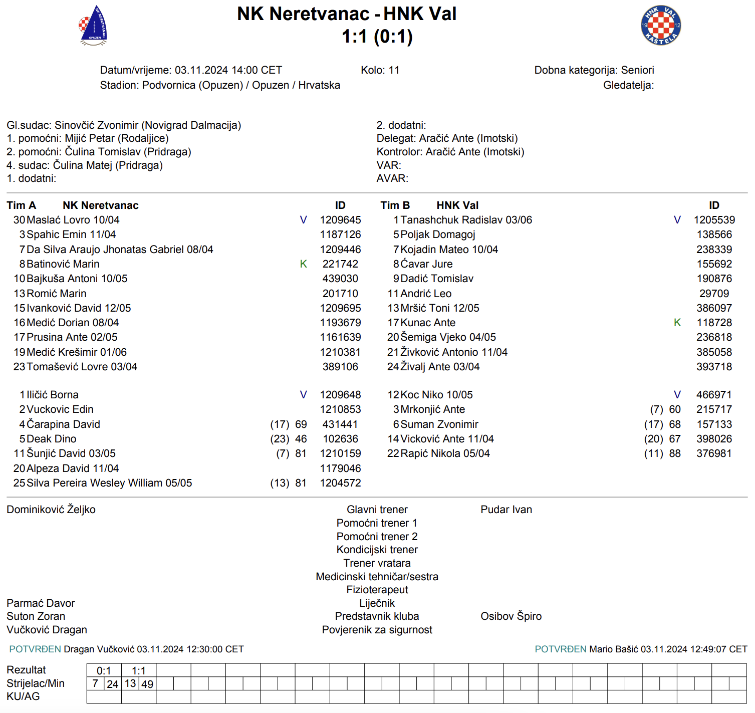 U Opuzenu su Neretvanac i Val podijelili bodove. Val je zabio u prvom poluvremenu, u 24. minuti, a strijelac je bio Mateo Kojadin. U drugom poluvremenu Neretvanac je izjednačio preko Marina Romića u 49. minuti. Obje ekipe trenutno se nalaze na sredini tablice – Val ima 16 bodova i nalazi se na 8. mjestu, dok je Neretvanac na 10. mjestu s 12 bodova.