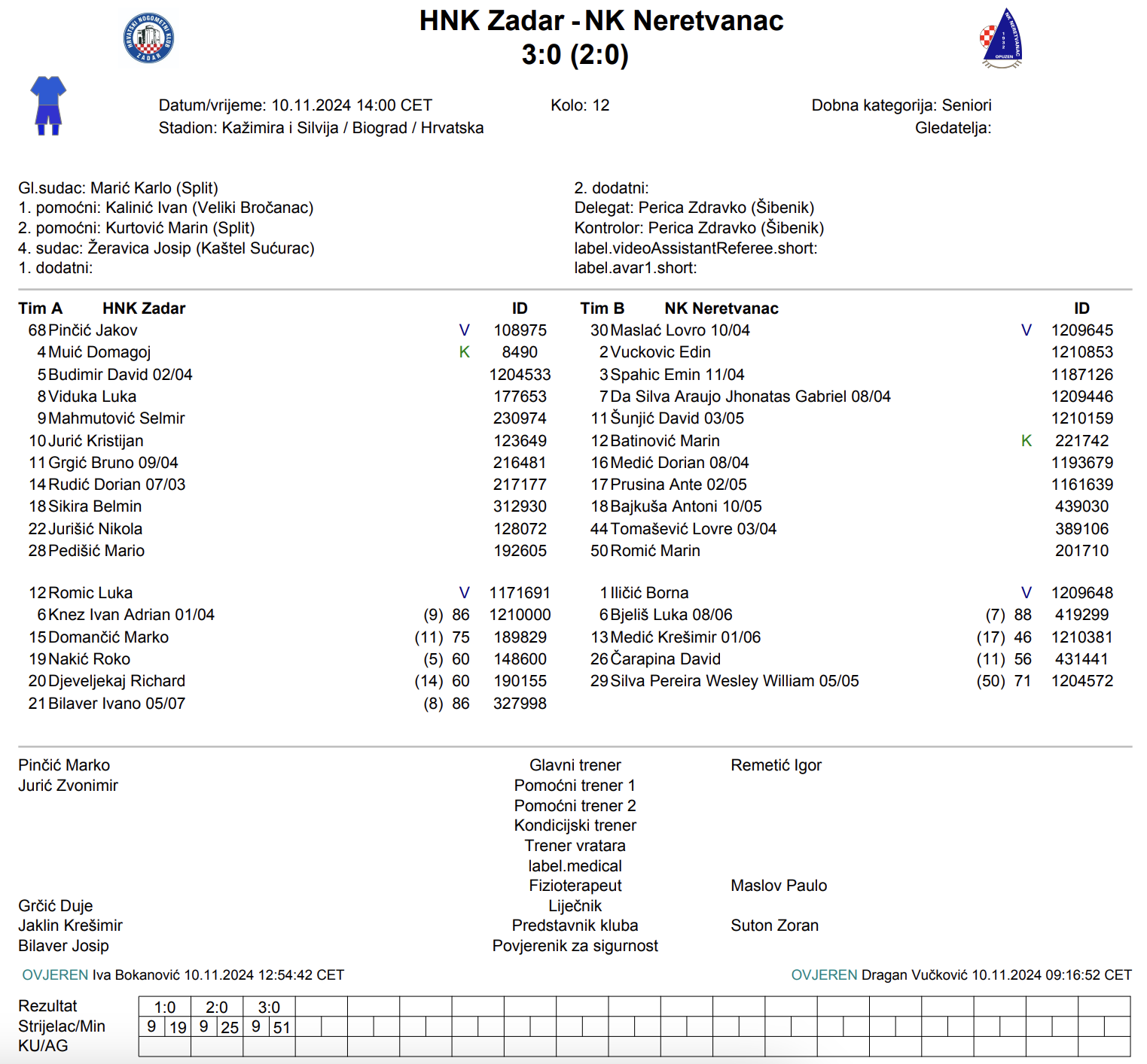 Posljednja utakmica 12. kola pripala je Zadru. Zadar je dočekao Neretvanac. U prvom poluvremenu Zadar je vodio 2:0, a oba pogotka postigao je Selmir Mahmutović u 19. i 25. minuti, s čime se otišlo na odmor. U drugom poluvremenu Zadar je samo potvrdio svoju nadmoć trećim pogotkom Mahmutovića u 51. minuti. Zadar je sada četvrti s 22 boda, a Neretvanac dvanaesti s 12 bodova.
