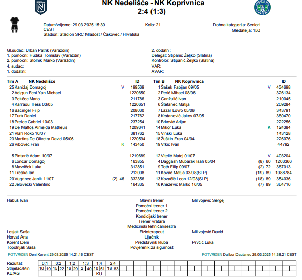 Trener Nedelišća, Ivan Habuš: “U susret smo ušli bez pola momčadi zbog suspenzija i ozljeda, sa samo 12 raspoloživih igrača, i jasno je bilo već od samog početka da ćemo teško parirati ekipi Koprivnice koja je od samog početka dominirala i bila opasna, pogotovo u napadačkom dijelu preko njihovog najboljeg igrača Brkovića, koji je i postigao odličan prvi pogodak i usmjerio utakmicu na njihovu stranu. Utakmica je bila riješena njihovim trećim golom i tek zadnjih 20 minuta, nakon izmjena u njihovom sastavu, pokušavali smo nešto, ali nije više bilo vremena za neki priključak u završnici utakmice. Moramo prihvatiti trenutnu realnost i nadati se da će se neki igrači oporaviti do sljedeće utakmice da bismo mogli koliko-toliko biti konkurentni. Opet nemam nikakve zamjerke za moje igrače, pogotovo ove mlađe koji su danas dobili minutažu i dali sve od sebe. Koprivnici čestitke na zasluženoj pobjedi.”