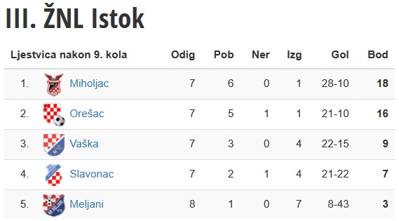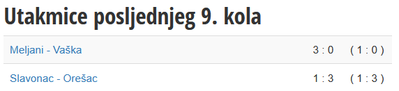 Odigrane su obje utakmice devetog kola 3.ŽNL VPŽ Istok! Drugoplasirani Orešac slavio je na gostovanju kod Slavonca iz Novaka 1:3, dok su u Donjim Meljanima Meljani s 3:0 svladali Bašku. Slobodna momčad ovo kolo bio je lider ljestvice Miholjac iz Gornjeg Miholjca!