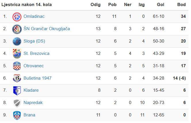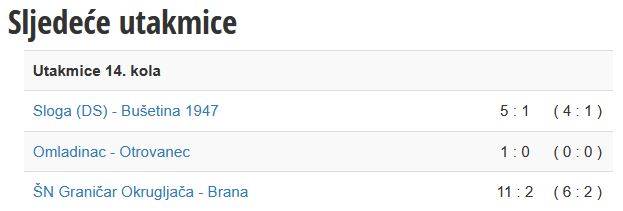 Drugoplasirani ŠN Graničar Okrugljača s dvadeset i četiri boda u sklopu četrnaestog kola ugostio je Branu iz Bačevca koja u svojih deset prethodnih susreta još nije obilježila niti jedan bod. Iznimno raspucani bili su momci iz Okrugljače koji su s jedanaest pogodaka počastili svoje goste! Čak pet pogodaka za domaćine postigao je Saša Ivanešić (32′, 58′, 69′, 78′ i 79′), s četiri zgoditka pridružio se Mateo Fučkar (10′, 18′, 23′ i 33′), dok su po jedan pogodak postigli Alen Fučkar (12′) i Marko Glumpak (77′). Oba pogotka za Branu postigao je Igor Miota (19′ i 24′).