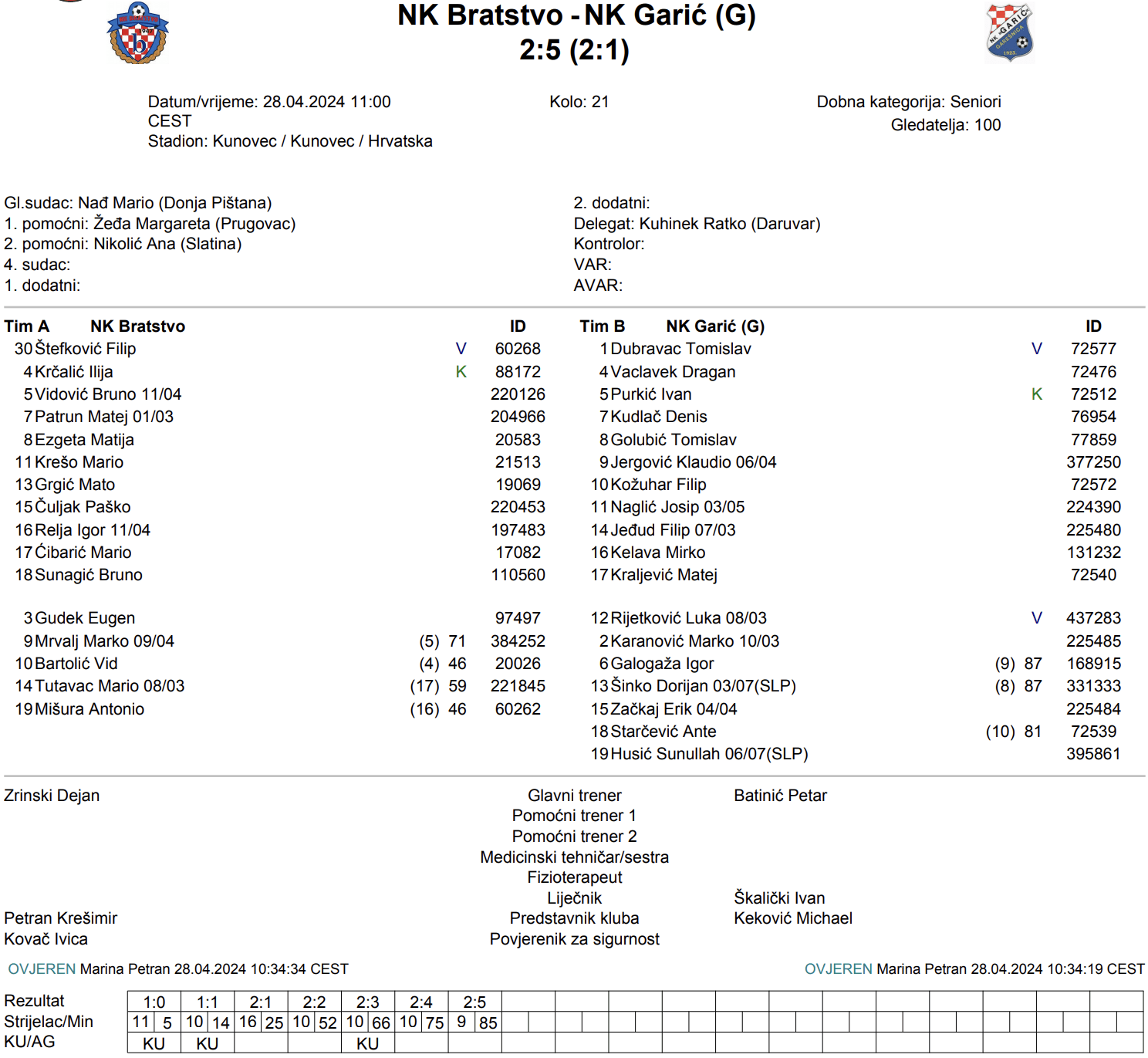 U Kunovcu je odigrana vrlo zanimljiva utakmica u kojoj je Garić bio u zaostatku dva puta, ali je uspio okrenuti utakmicu i pobijediti. Bratstvo je povelo iz kaznenog udarca koji je realizirao Mario Krešo, a deset minuta kasnije Filip Kožuhar izjednačuje rezultat također iz kaznenog udarca. Na odmor se otišlo rezultatom 2:1 nakon što je Igor Relja u 25. minuti zabio za novo vodstvo Bratstva. U drugom poluvremenu postojala je samo jedna ekipa – Garić. Možemo slobodno reći da je jedan igrač dominirao, a to je Filip Kožuhar koji je postigao još tri pogotka, a utakmicu je zaključio Klaudio Jergović. Kožuhar sada drži prvo mjesto na ljestvici strijelaca lige sa 19 golova, dva više od Matije Bubaše.