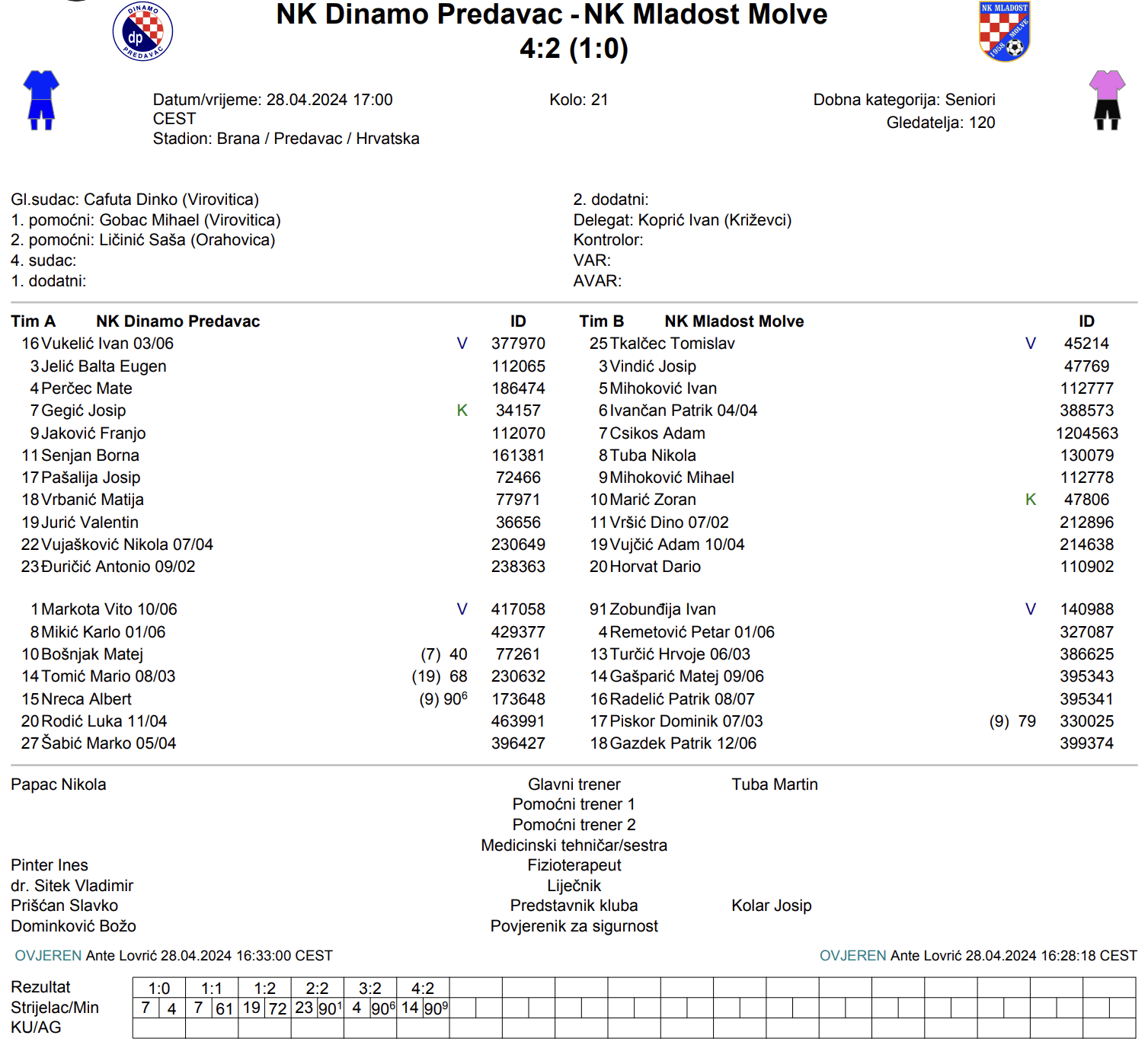– Uoči ove utakmice imali smo puno problema jer su nam nedostajala čak četiri igrača: Kos (isključen), Varat (ozlijeđen), Bošnjak Dominik (ozlijeđen) i Filjić (na službenom putu). Ipak, već u 4. minuti Senjan krade loptu obrani i daje Gegiću za rano vodstvo 1-0. Nakon toga, imali smo još dvije ili tri izgledne prilike koje nismo iskoristili dok protivnik nije ozbiljnije zaprijetio. U 40. minuti Gegić je povrijedio, što je dodatno utjecalo na kvalitetu naše igre. U 61. minuti gosti su iskoristili loše postavljanje naše zadnje linije i izjednačili rezultat na 1-1. U 67. minuti postigli smo gol, ali suci su ga poništili zbog zaleđa. U 72. minuti Senjan vraća kratku loptu Perčecu, što gosti koriste i postižu gol za 1-2. U 82. minuti Vrbanić iz jedanaesterca pogađa stativu, dok Matej Bošnjak iz drugog jedanaesterca pogađa prečku. Mi se nismo predali, te smo u 91. minuti golom Đuričića izjednačili na 2-2, a u 96. minuti Perčec zabija za 3-2. No, tu nije bio kraj jer je Tomić u 98. minuti postigao gol za konačnih 4-2 u ovoj uzbudljivoj utakmici koju smo ipak na kraju zasluženo pobijedili. – rekao je za Sportalo trener Dinama, Nikola Papac.