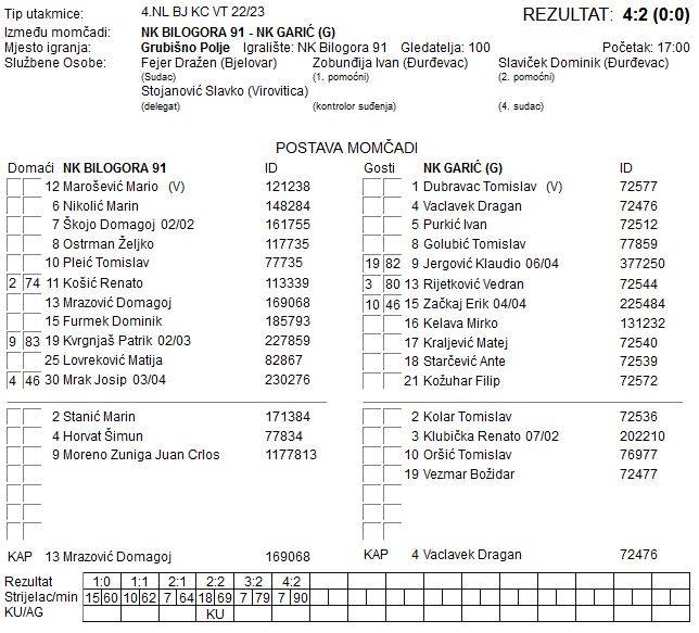 Pred stotinjak gledatelja mreže se u prvom poluvremenu nisu tresle, da bi domaćini stigli u vodstvo u 60. minuti susreta pogotkom Dominika Furmeka. Dvije minute kasnije na 1:1 kod gostiju susret izjednačuje Tomislav Oršić, no već dvije minute kasnije Domagoj Škojo donosi novu prednost domaćinu. U 69. minuti ponovno odgovara Slatina novim izjednačenjem ovaj put iz kaznenog udarca kojeg je u pogodak pretvorio Ante Starčević. Pobjedu Bilogori s ukupnih 4:2 donio je sa svoja nova dva pogotka kojim je kompletirao hat-trick Domagoj Škojo.