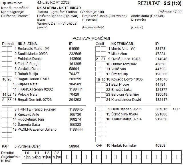 Na susretu na kojem se okupilo stotinjak gledatelja domaćin Slatina poveo je u dvadeset i petoj minuti susreta pogotkom Matije Bubaša te se s minimalnih 1:0 odlazi na predah. Gosti iz Cvetkovca odgovaraju nedugo nakon predaha, odnosno u sedmoj minuti nastavka kada rezultat za Tehničar poravnava Luka Kranclbinder. U 68. minuti gosti dolaze u vodstvo pogotkom Ivana Vrkića i taj je rezultat stajao sve do devedesete minute. Tada Dorian Bogati pogađa za konačnih 2:2 i donosi vrijedan bod domaćinu Slatini.