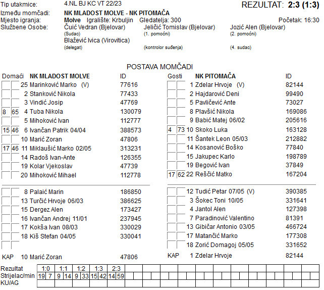 U odličnom susretu pred oko tristo gledatelja Mladost iz Molva došla je do vodstva u sedmoj minuti susreta pogotkom Vjekoslava Kolara. Sedam minuta kasnije na 1:1 izjednačuje Matej Babić, a isti igrač strijelac je i u 33. minuti za vodstvo Pitomače 1:2. Prednost gostiju udvostručio je Karlo Jakopec u 42. minuti susreta. Domaćin je uspio smanjiti na 2:3 u pedeset i devetoj minuti pogotkom Ivana Ante Radoša, no bodovi iz ovog susreta idu put Pitomače.