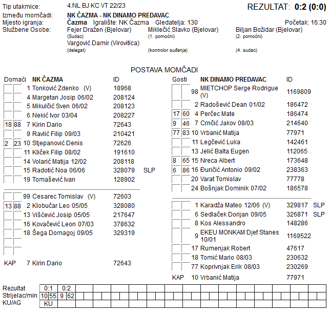 Pred 130 gledatelja u prvom poluvremenu mreže se nisu tresle, da bi u desetoj minuti drugog poluvremena Matija Vrbanić doveo Dinamo u vodstvo. Vodstvo gostiju iz Predavca udvostručio je Djef Stanes Ekeu Monkam za konačnih 0:2 i nastavak odlične proljetne forme Dinama!