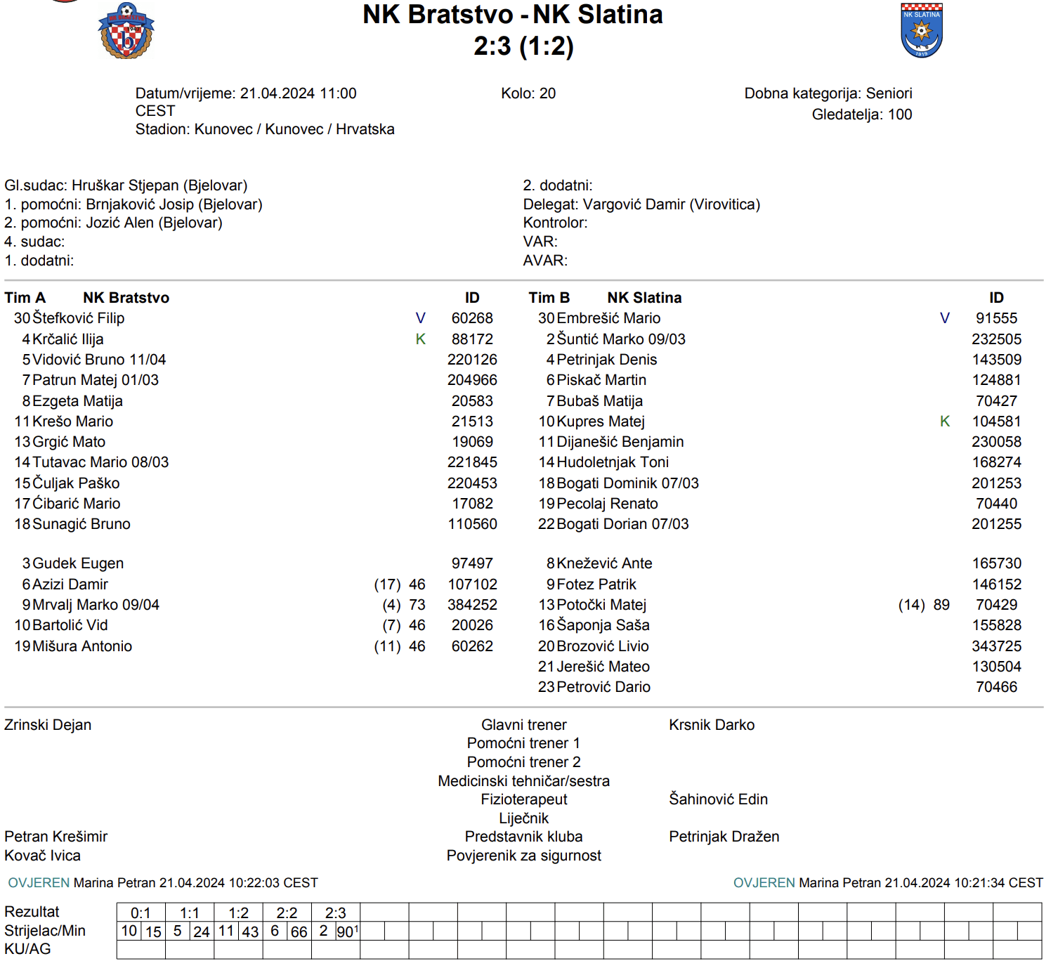 Bratstvo i Slatina su odigrali odličnu utakmicu u jutarnjem terminu, gdje je pobjeda mogla otići i na jednu i na drugu stranu. U 15. minuti Slatina otvara utakmicu preko svog kapetana Mateja Kupresa, ali prednost nije dugo trajala. Nakon 9 minuta, ekipa iz Kunovca zabija za 1:1 preko Brune Vidovića. Pri kraju prvog poluvremena, Benjamin Dijanešić ponovno dovodi Slatinu u prednost i s rezultatom 1:2 se odlazi na odmor. U 66. minuti, ironično, igrač sa brojem 6, Damir Azizi, postiže pogodak i vraća Bratstvo u igru. I kada se utakmica privodila kraju, svi su mislili da će završiti rezultatom 2:2. Međutim, pojavljuje se Marko Šuntić i postiže pobjednički pogodak za Slatinu, donoseći im 3 vrlo važna boda.