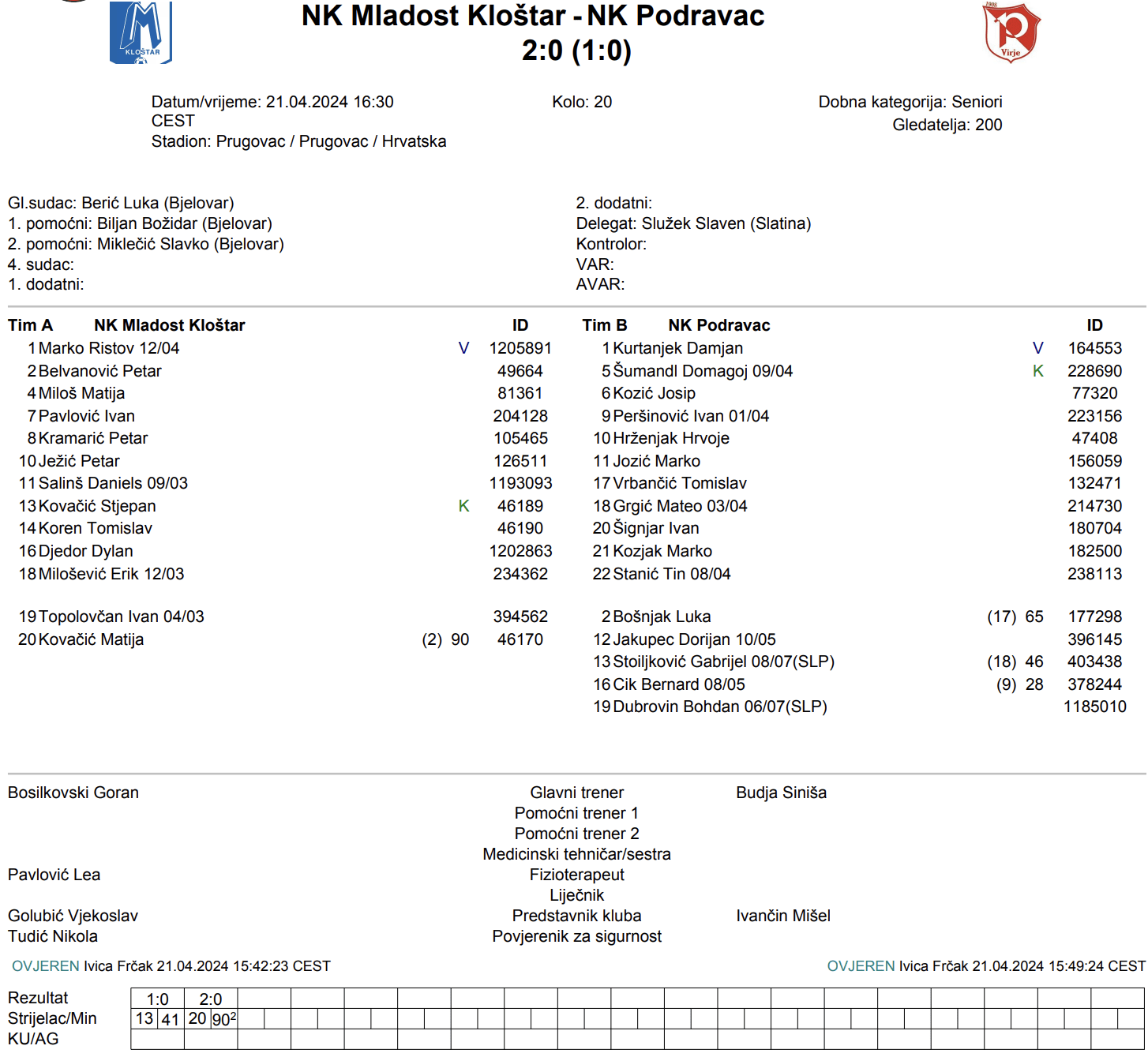 Mladost i Podravac su odigrali, po svemu sudeći, tešku i čvrstu utakmicu. Desetkovana Mladost je iskoristila svoje prilike u 41. i 92. minuti preko Stjepana Kovačića i Matije Kovačića te odnijela vrlo važna 3 boda, povećavajući tako svoju bodovnu prednost nad Podravcem.