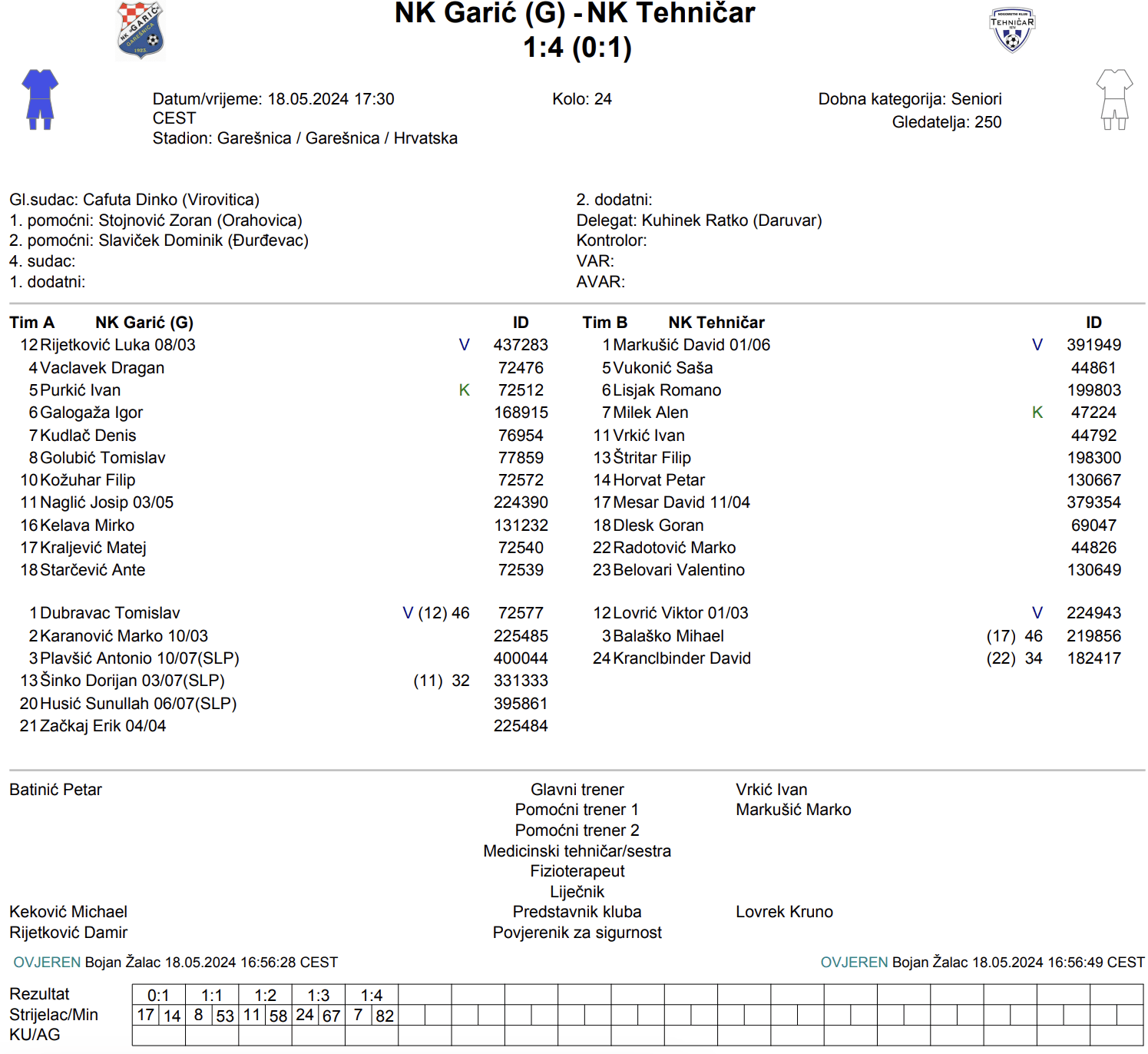Tehničar je ovom pobjedom osigurao naslov prvaka. David Mesar je u 14. minuti doveo Tehničar u vodstvo i s rezultatom 0:1 se otišlo na odmor. U drugom poluvremenu Garić izjednačava u 53. minuti preko Tomislava Golubića, no nedugo zatim Ivan Vrkić ponovno dovodi Tehničar u vodstvo. Nakon ovog gola Garić je pao, a Tehničar je nastavio zabijati. David Kranclbinder u 67. minuti povećava rezultat na 1:3, dok Alen Milek u 82. minuti postavlja konačan rezultat.