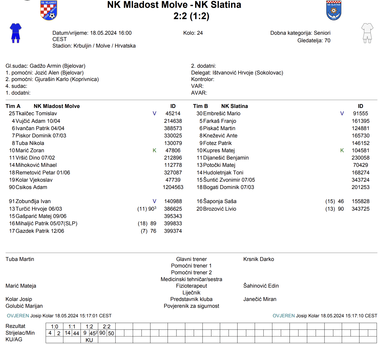 Molve su uspjele doći do boda na domaćem terenu. Molve su ostale na pretposljednjem mjestu, dok je Slatina pala na 5. mjesto na tablici. Mladost je povela u 2. minuti preko Adama Vujčića. Slatina je preokrenula rezultat u svoju korist unutar 3 minute. Prvo je Toni Hudoletnjak zabio u 44. minuti, dok je Patrik Fotez u 47. minuti postigao gol za preokret iz kaznenog udarca. U 50. minuti drugog poluvremena Adam Csikos izjednačava rezultat i donosi veliki bod Mladosti
